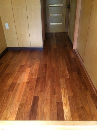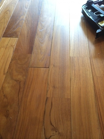 宮崎市の住宅のリフォームで無垢のフローリング(ゴールデンチークウレタン艶消し)に貼り変えました。